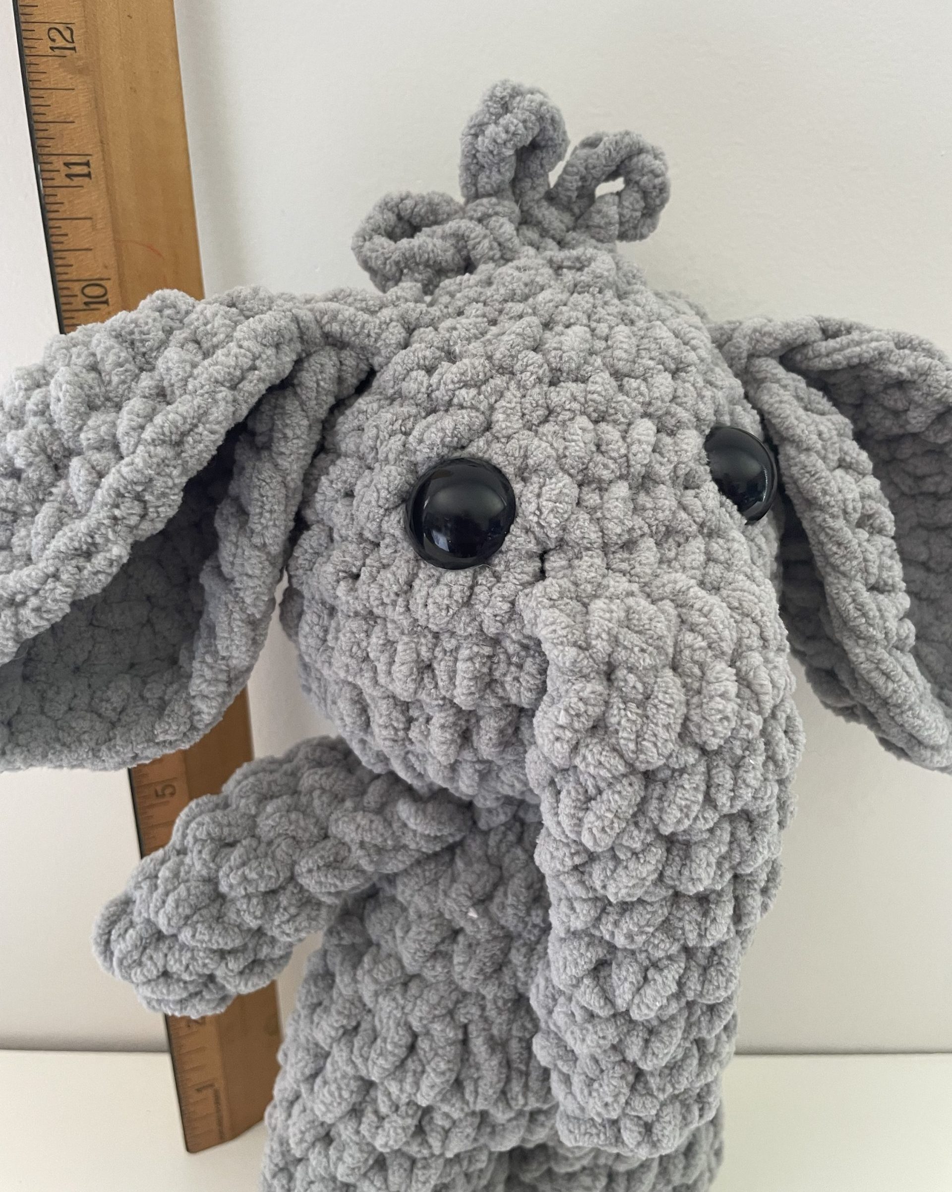 This small elephant plushie is available in original gray and a soft pink. It’s a perfect heirloom gift for all ages. The large safety eyes gives this toy, an adorable expression. Handmade crochet.