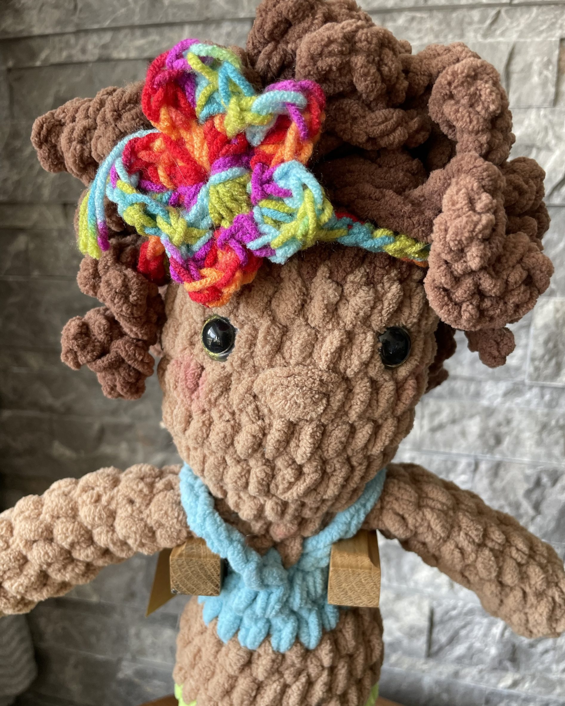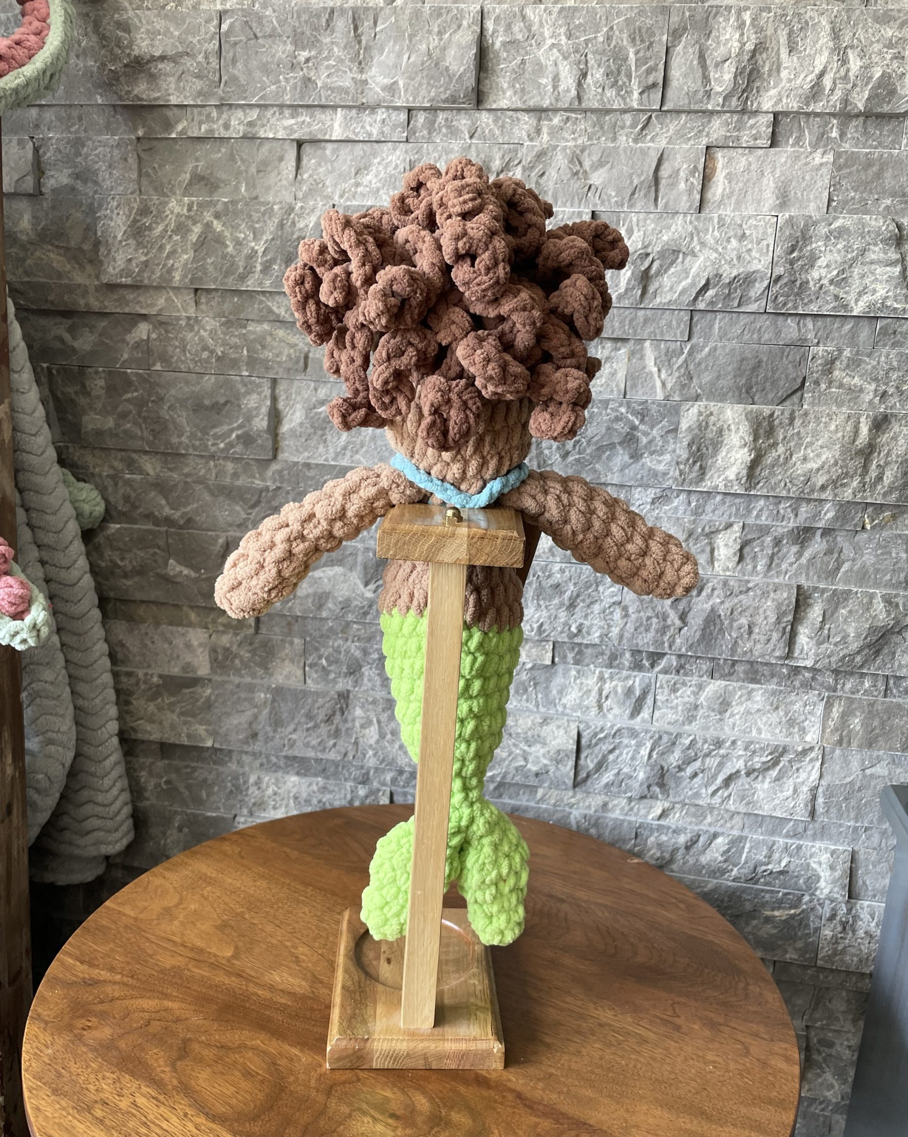 Beautiful handmade crochet mermaid plushie with brown hair, beautiful tan body, vivid green fin and turquoise top. Adorned with a single flower headband and measures 18 1/2 inches tall. This plushie doll has sparkly green safety eyes.